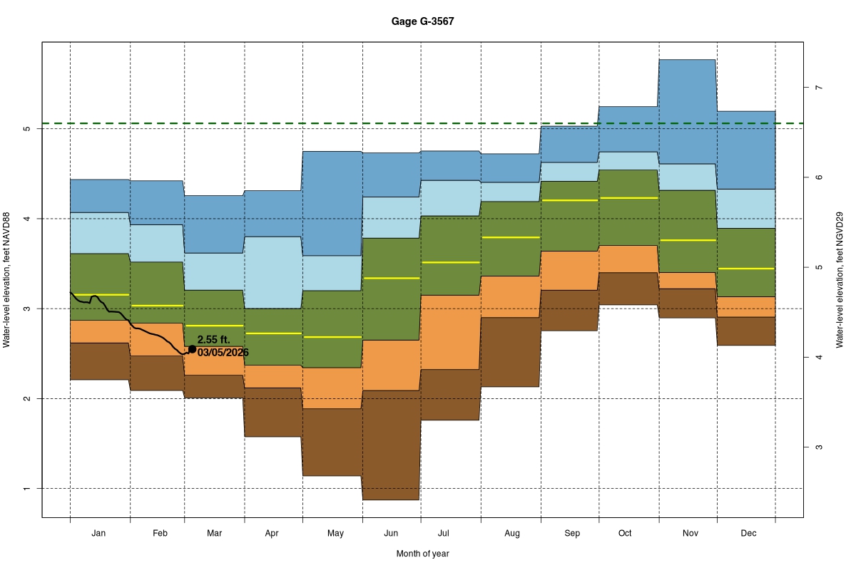 | Daily Water Level Percentiles by Month for G-3567 (percentiles based on 1/1/2000–2025) |