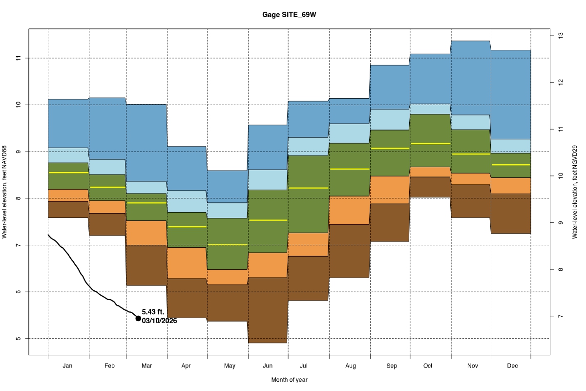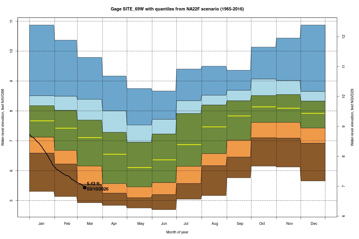 | Daily Water Level Percentiles by Month for SITE_69W (percentiles based on NA22F model 1965–2016) |