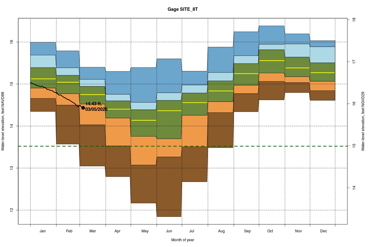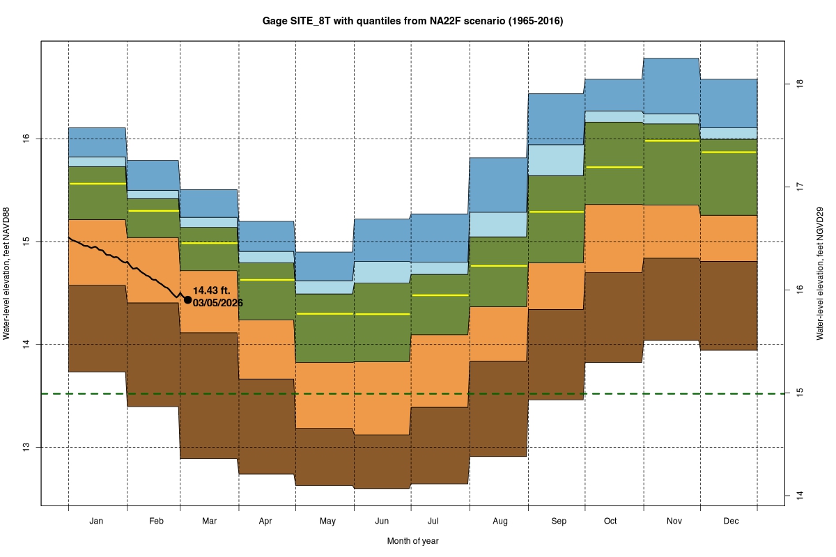 | Daily Water Level Percentiles by Month for SITE_8T (percentiles based on NA22F model 1965–2016) |