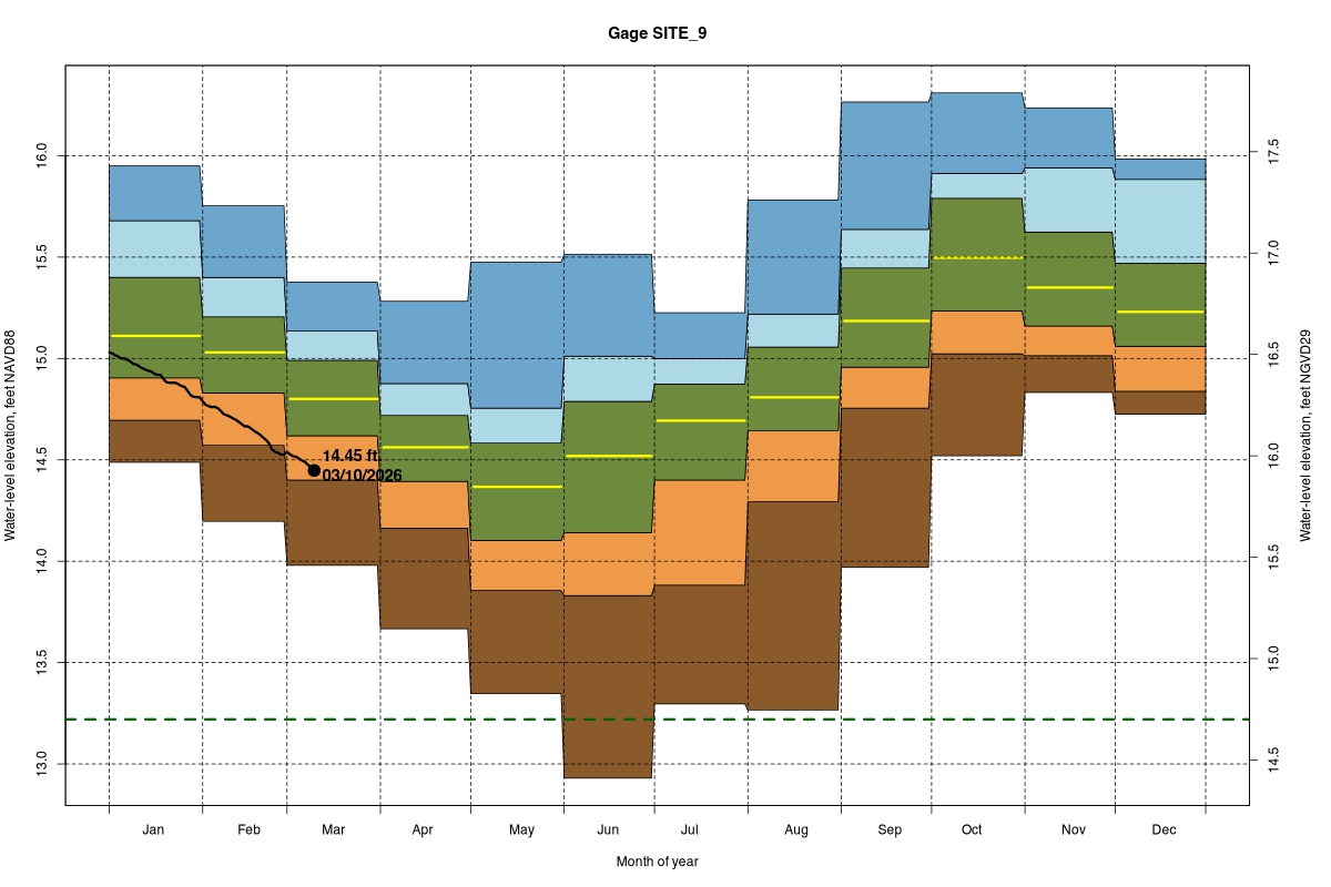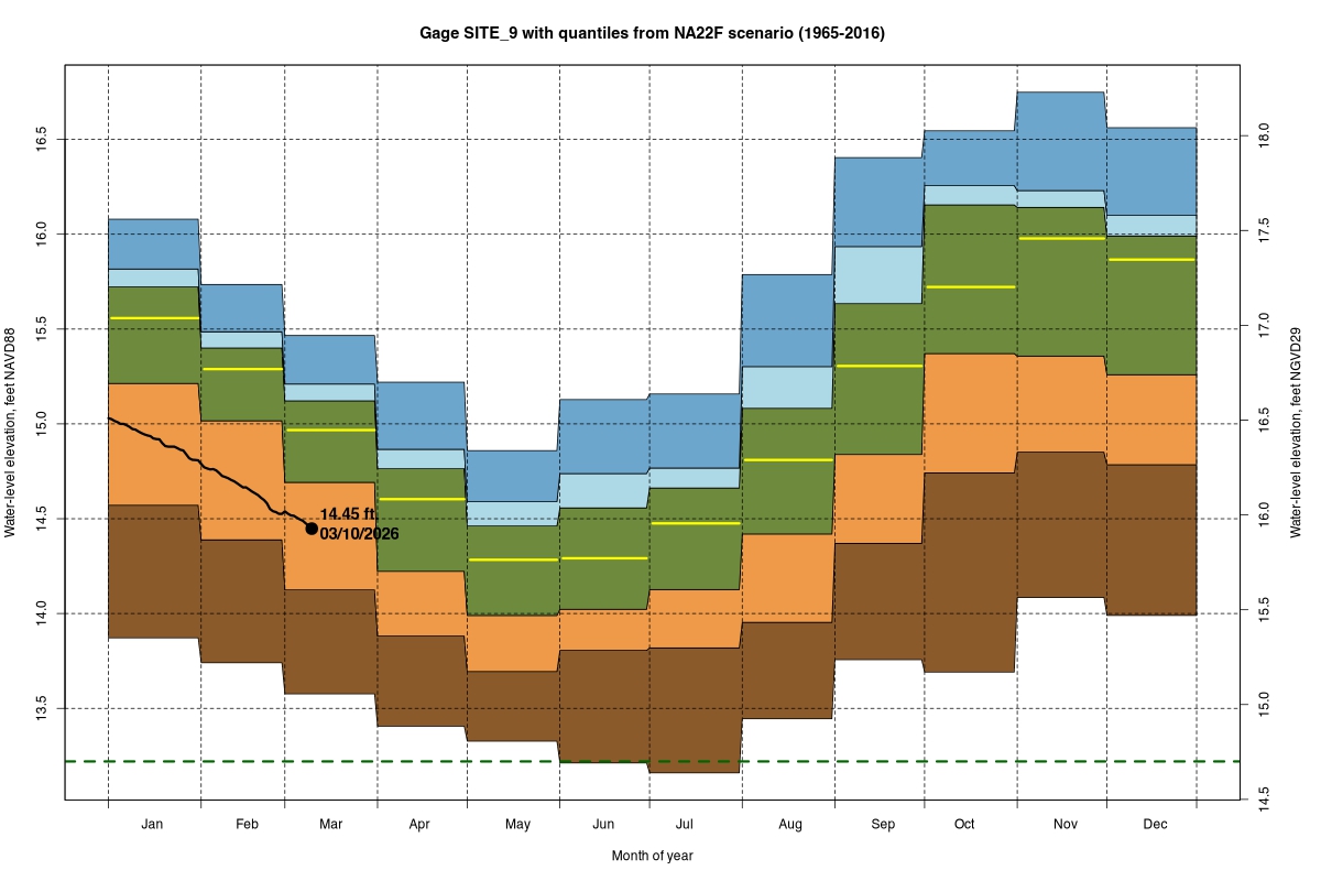 | Daily Water Level Percentiles by Month for SITE_9 (percentiles based on NA22F model 1965–2016) |