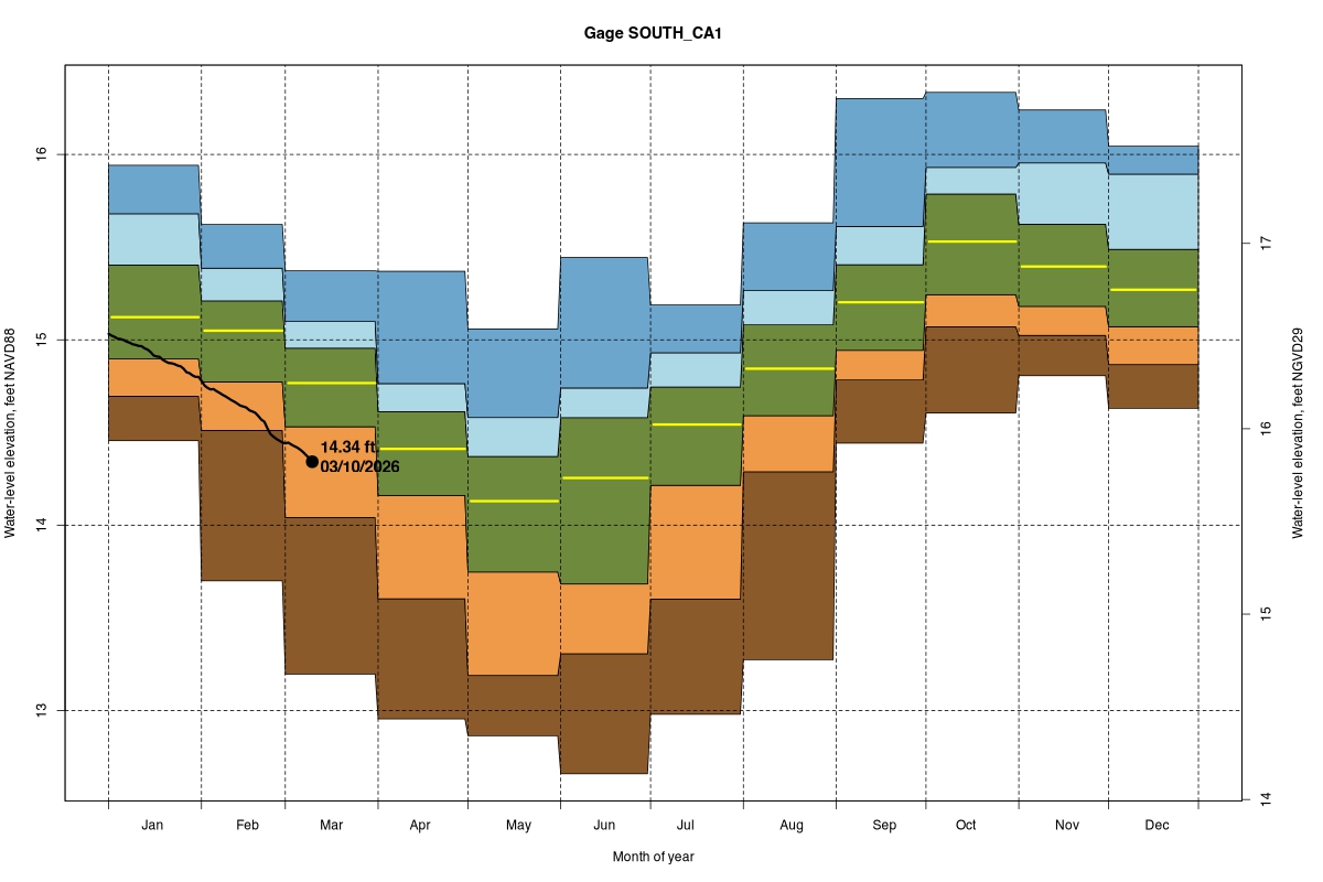 | Daily Water Level Percentiles by Month for SOUTH_CA1 (percentiles based on NA22F model 1965–2016) |